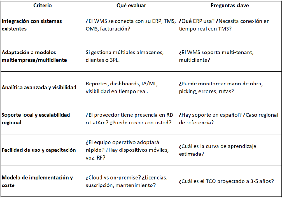 Seleccionar el “mejor” WMS para su empresa logística en República Dominicana implica evaluar cuatro dimensiones clave: madurez operativa, procesos actuales, objetivos futuros y ecosistema tecnológico. A continuación, criterios detallados: